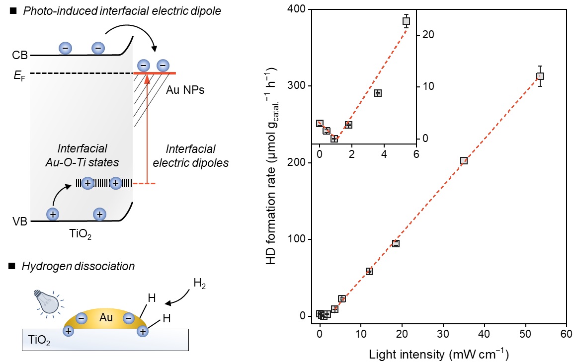 科研人员以金/二氧化钛(Au/TiO2)为模型催化剂,利用紫外光激发TiO2,研究结果认为:光激发产生的电子可迁移到Au纳米颗粒上而被束缚;同时,由于Au纳米颗粒和TiO2的界面存在Au-O-Ti组成的缺陷态,光生空穴会在界面处被捕获。研究发现,由于空穴和电子分别在界面Au-O-TiAu纳米颗粒上,从而形成了空间邻近的束缚态电子-空穴对。Au/TiO2在常温条件下同时存在氢气异裂的热催化机制,与Au/TiO2上光催化氢气异裂的机制叠加,使科研人员观察到该反应活性随着光强增强先降低后呈线性增加的现象。